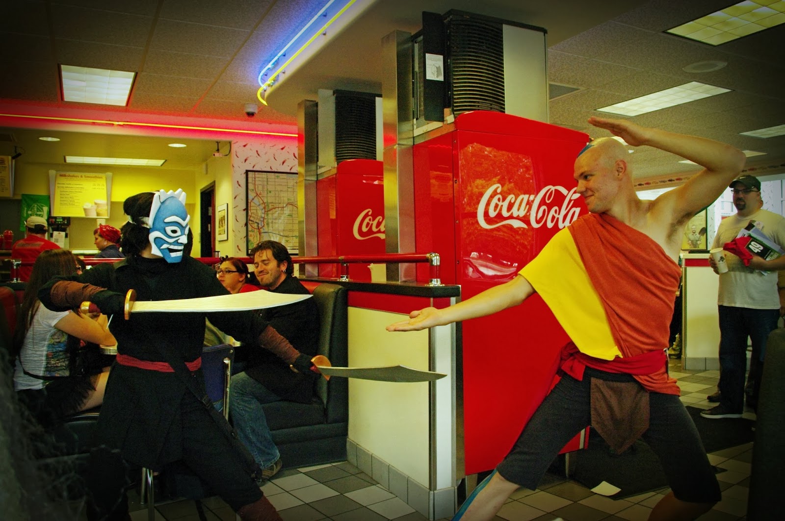 This coincidence was just too perfect. The other kid is the Blue Spirit who is Connor's character's enemy in the show. People in the Burgerville were pretty stoked |